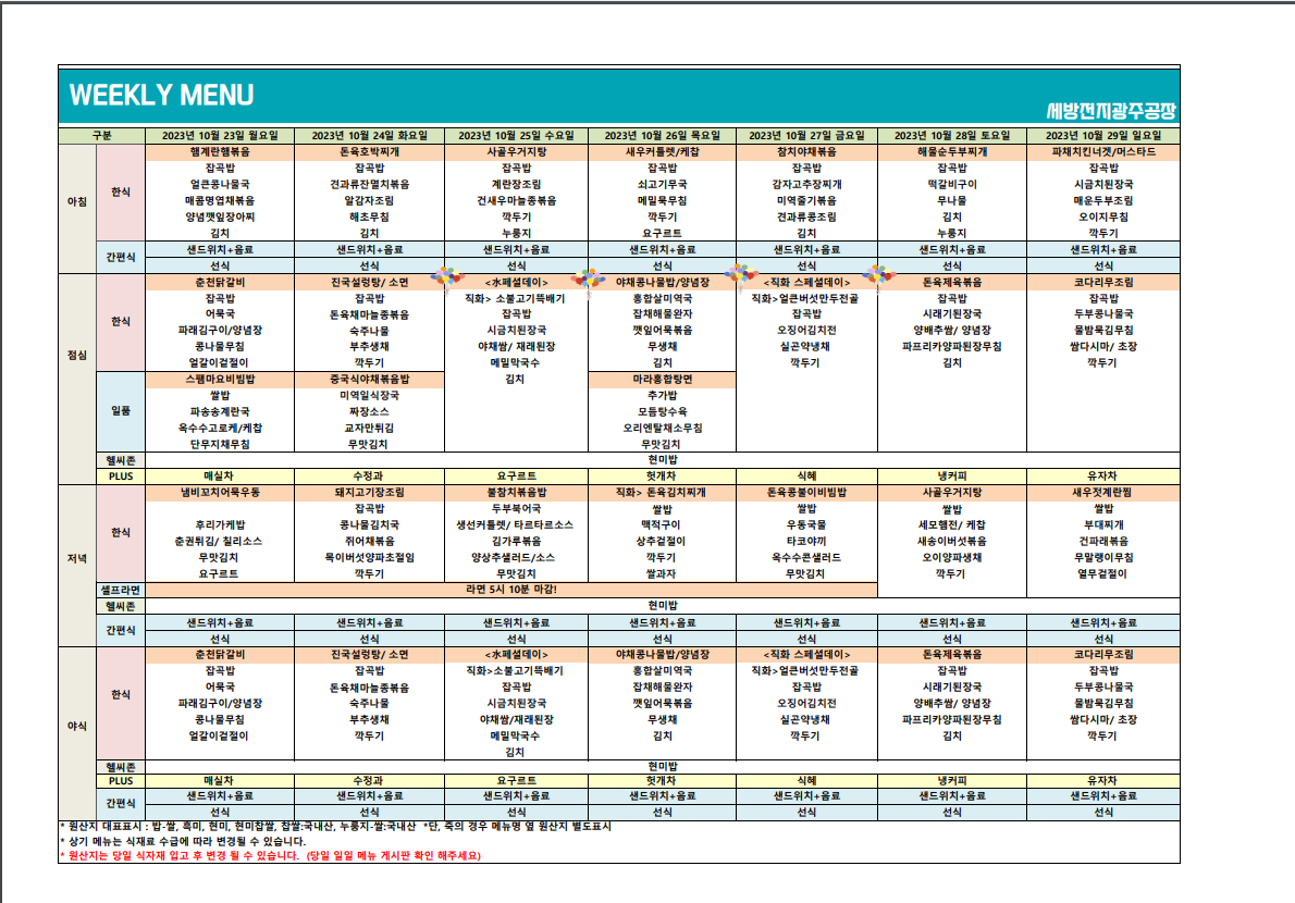 (식단표)10월23일~29일