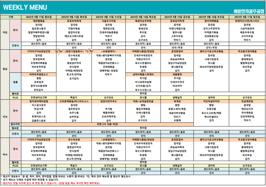 (식단표)9월11일~17일