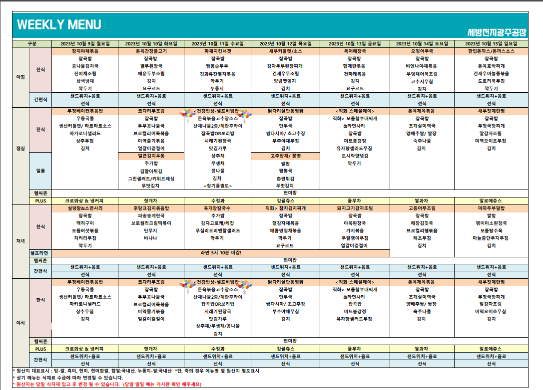 (식단표)10월9일~15일